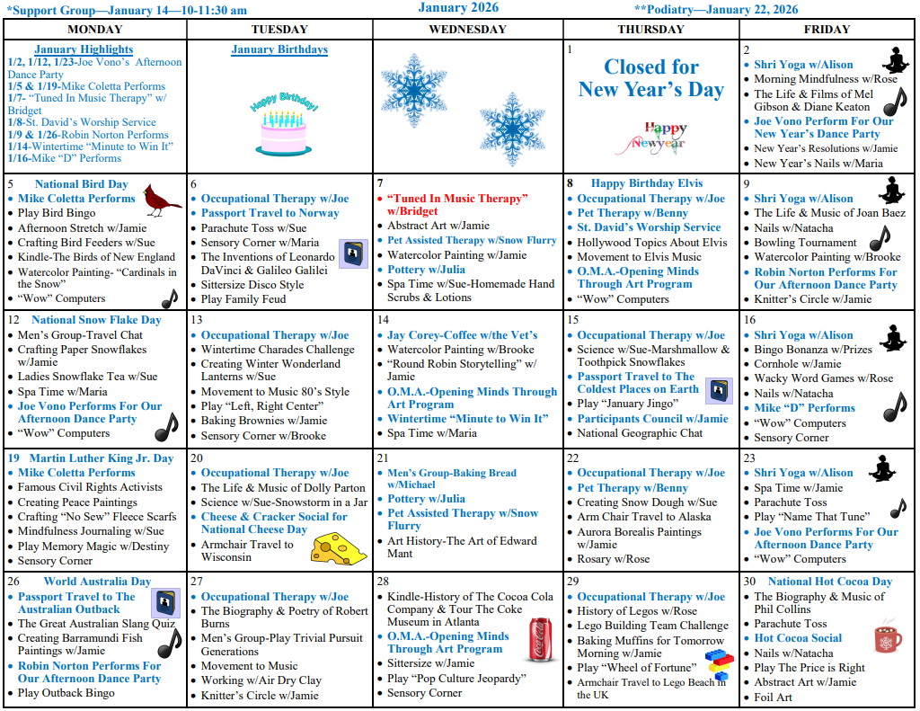 Calendars January 2026 Activities CalendarDownload January 2026 MenuDownload Contact Us 25 Brayton AvenueCranston, RI 02920USA (401) 946-9220 info@hopealzheimerscenter.org Facebook